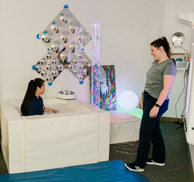 Pictured above: RiverView Occupational Therapist Maddie Engelstad (right) shows one of the 2023 Scrubs Camp participants some of the equipment used in the sensory room.