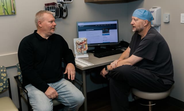 Pictured above: Brian Grunhovd, left, and Dr. Brett Vibeto discuss Grunhovd’s recent colonoscopy at RiverView Health.