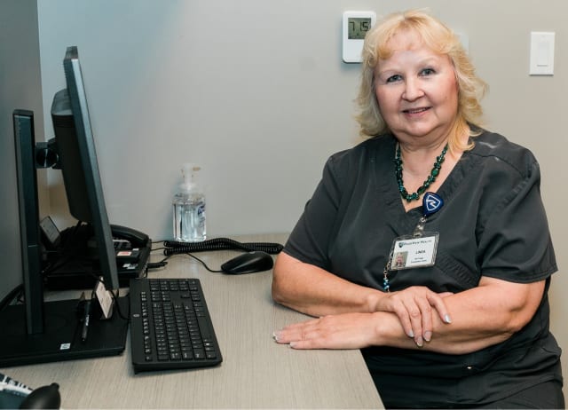 Linda started at RiverView Home Care and Hospice in 2000. From there, she was named manager of Adult Day Services, where she worked for seven years while continuing to work in Home Care. From 2020 to 2022, she worked in the Clinics Department as a COVID-19 and triage nurse. She was often credited for her gentle touch when testing potential COVID patients. Next, she transitioned to Procedures and Infusions while also serving as an RN float in the Clinic. For two of those years, she worked consistently with Gastroenterology, Urology, and Integrative Radiology Pain Management while also floating between other specialties, including Family Medicine and outreach clinics. Today she most consistently works with Dr. Parikh in Pain Management but continues to work throughout the Clinic.