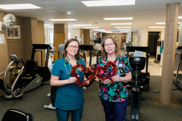 Pictured above: Stephanie Korynta (left), RRT, CPFT, AE-C, and Wanda Sorum, BS, RRT, Cardiac/Pulmonary Rehab coordinator, are pictured in the exercise area of the department. Much of the equipment has been donated by present or previous Cardiac Rehab patients in thanks for the exceptional service provided by Korynta, Sorum, and the rest of the Cardiac Rehab Team.
